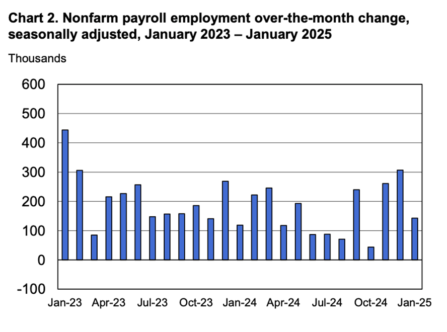 Total U.S. nonfarm payroll employment rose by 143,000. The official unemployment rate, U-3, decreased to 4.0%. The November and December 2024 combined employment numbers were revised higher by 100,000 than previously reported.